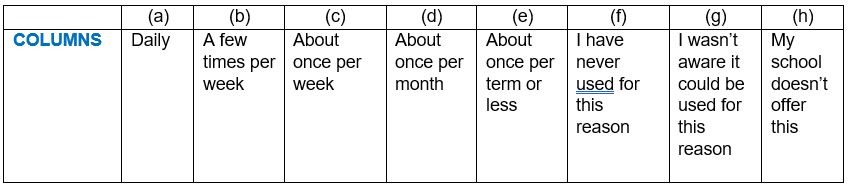 Q13. How often did you visit your school’s physical bookstore location(s) in the past year to do each of the following?