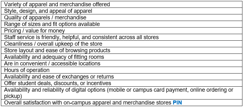 Q3. Please rate your satisfaction with the following aspects of the apparel and general merchandise store(s) on campus.