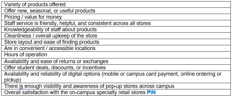 Q4. Please rate your satisfaction with the following aspects of the specialty retail store(s) on campus including tech stores, gift stores, and/or pop-up shops.